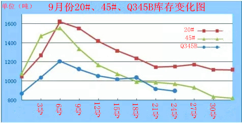如下圖所示:9月份聊城無縫管廠家20#、45#、Q345B等材質(zhì)庫存均有不同程度下降,從圖中可以看出,從9月6號以后203、45#廠家?guī)齑嫦陆得黠@,Q345B下降幅度趨緩;而20#、45#現(xiàn)貨庫存下降并沒有帶來價(jià)格上漲,至9月中旬無縫管價(jià)格降幅10元/噸,Q345B成交價(jià)格降上個(gè)月變化不大,聊城市場報(bào)價(jià)弱穩(wěn),成交不暢,9月24號以后在沒有新資源到貨。